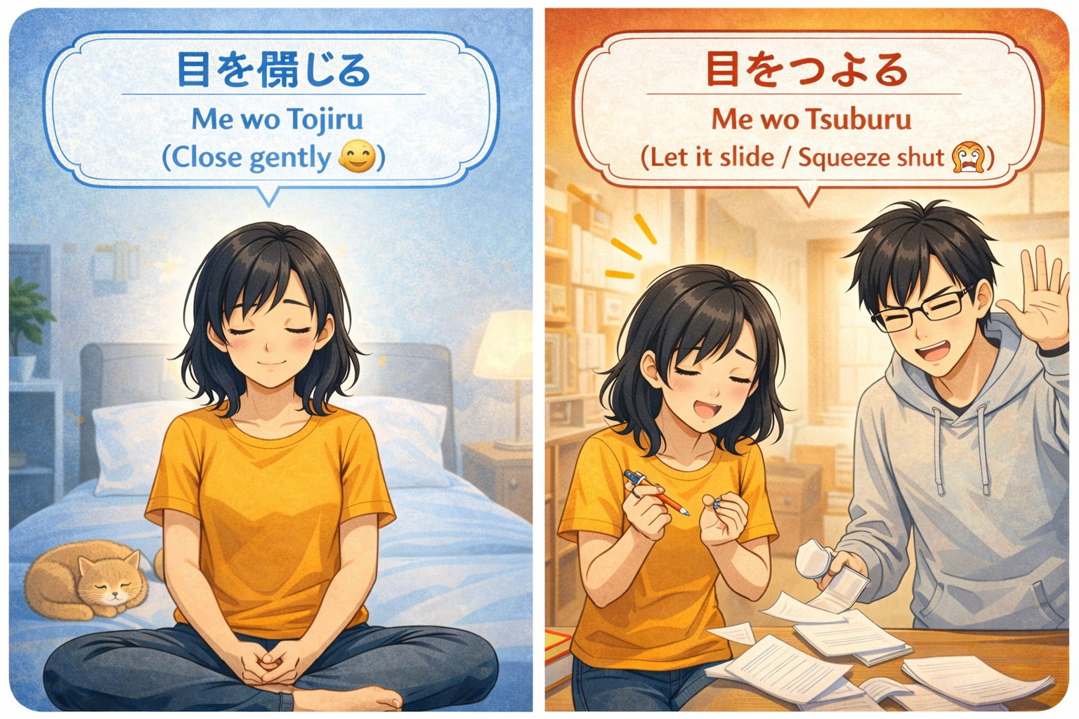 In Japanese, you have two ways to “close your eyes.” One is a gentle, physical action. The other means shutting them tightly, or metaphorically “pretending not to see something.” Let’s learn this useful idiom with Joy and Ken!