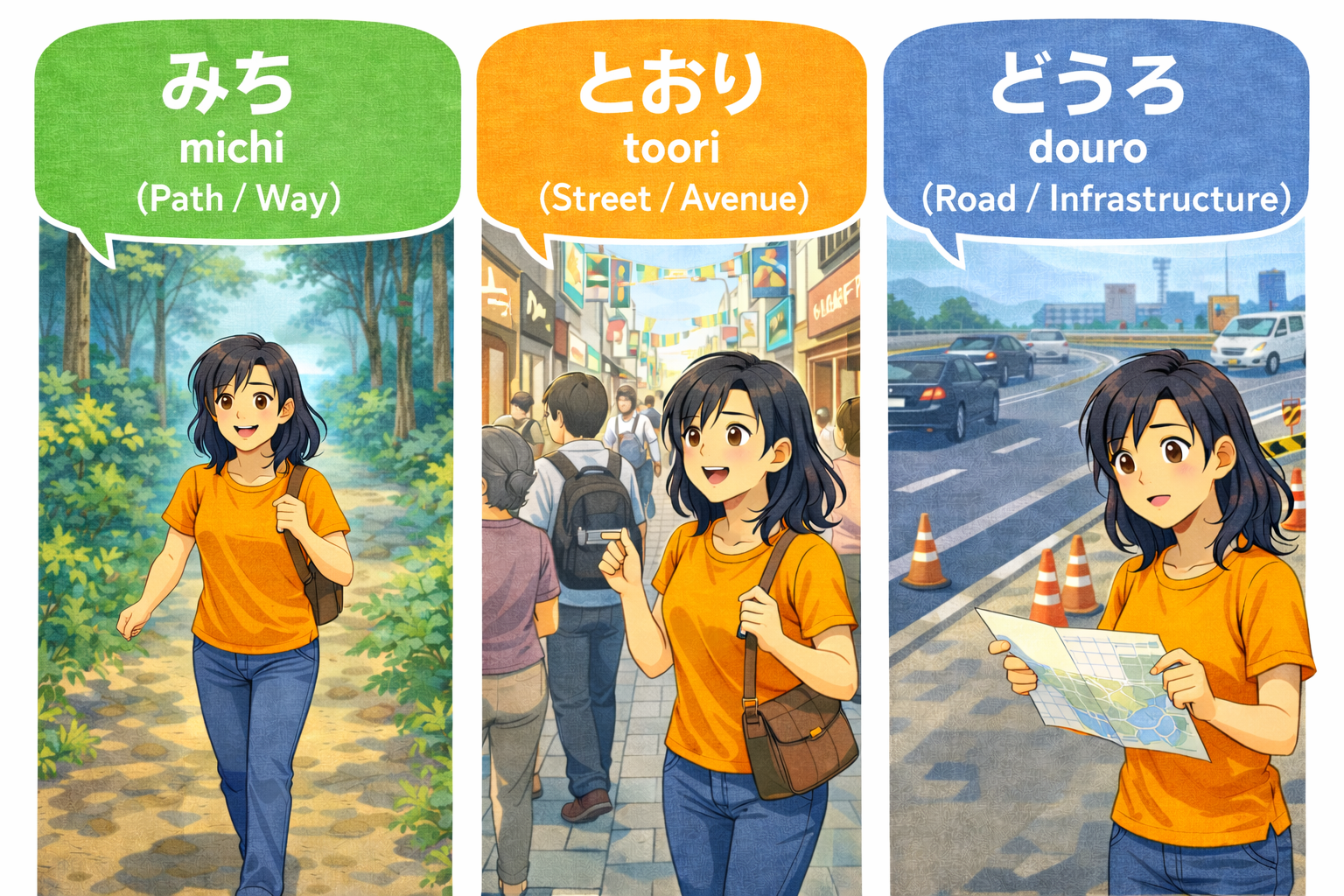 Japanese has three main words for “Road”. 道 (Michi) is the general path, 通り (Toori) is a street for passage, and 道路 (Douro) is the paved infrastructure. Let’s clear up the confusion with Joy and Ken.